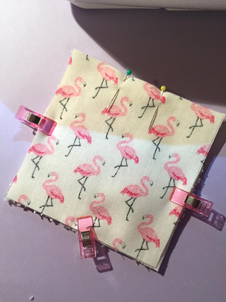 Epinglez ensuite 3 cotés du carrés, et mettez un repères sur le dernier coté. Il faut un espace d'environ 3 cm que vous n'allez pas coudre.
