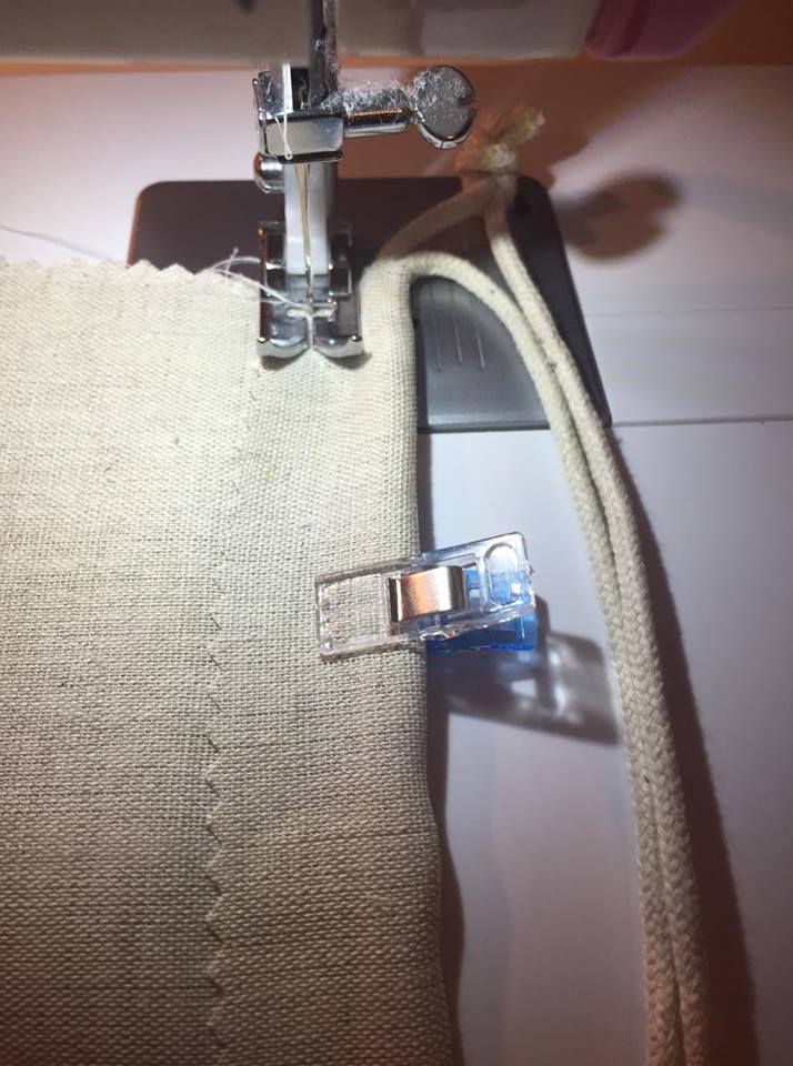 - Deux morceaux de corde qui font chacun 15 cm en plus que le double de la largeur de votre tissu ( ici j'ai deux cordes de 65 cm).